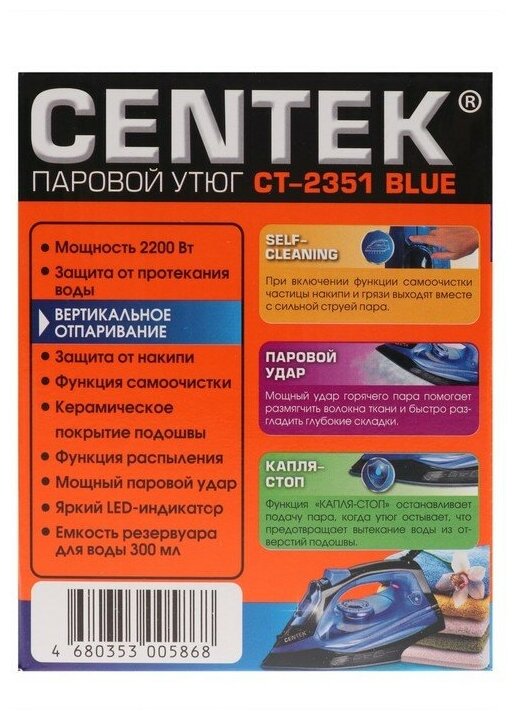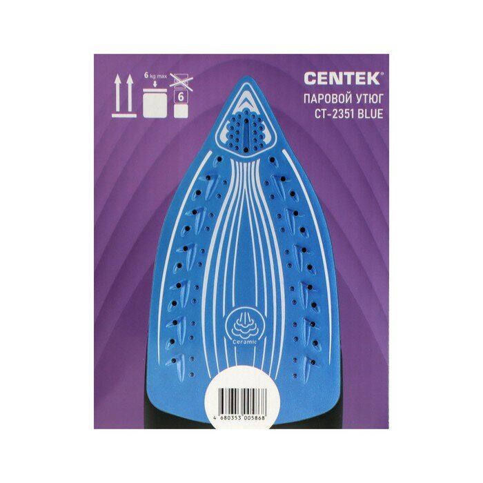 Утюг Centek CT-2351, 2200 Вт, керамическая подошва, 300 мл, синий Centek 2868515 .