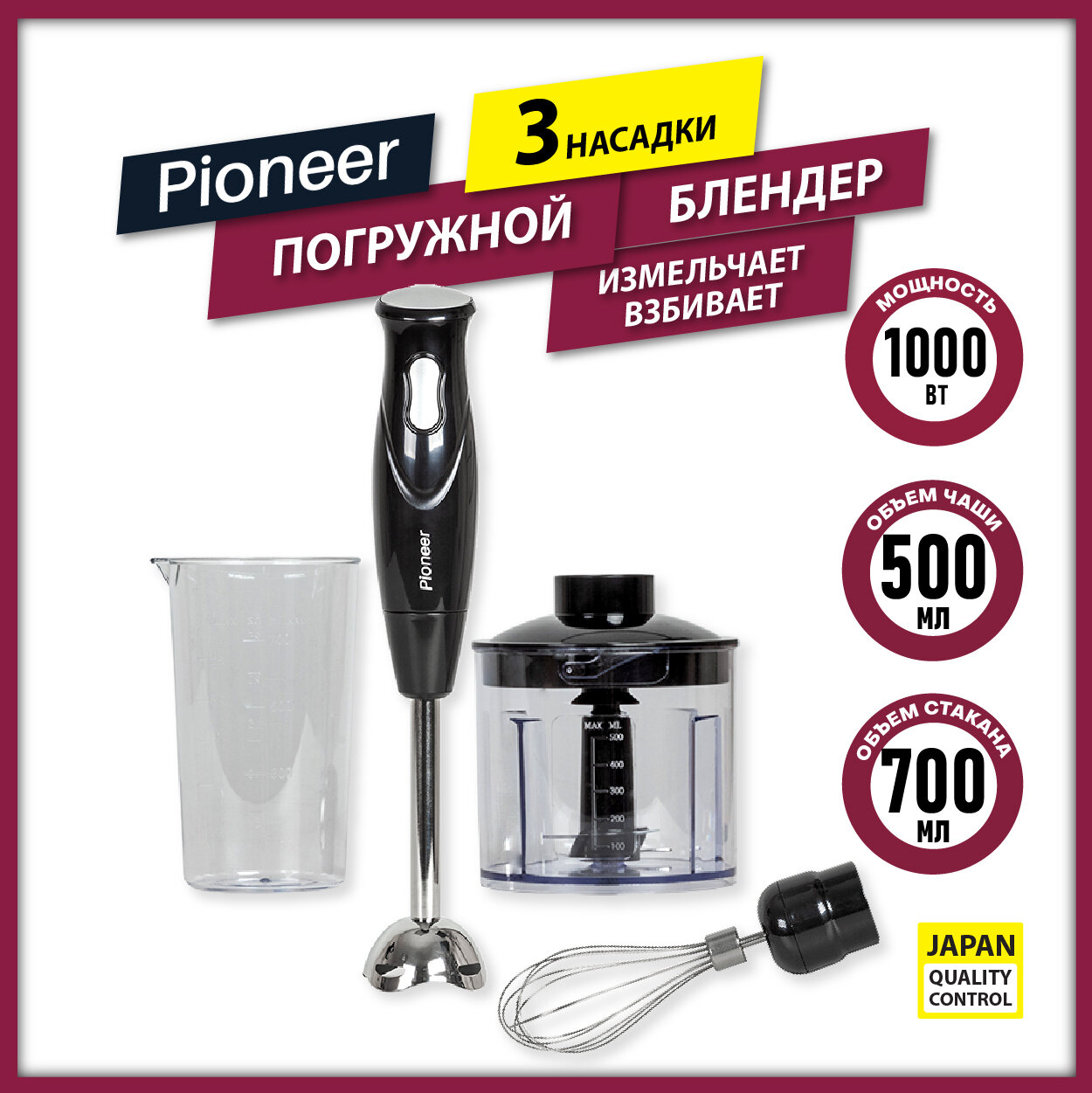 Блендер 3 в 1 Pioneer HB127S, миксер + измельчитель c S-образным ножом для твердых продуктов, 3 насадки, 1000 Вт