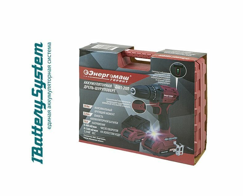 Аккумуляторная дрель-шуруповерт Энергомаш "гарант"ДШ1-20Л (20В, 2 скор, 2 акк.Li-Ion, 2,0Ач, 31 Н*м, быстрый заряд, подсветка, кейс)