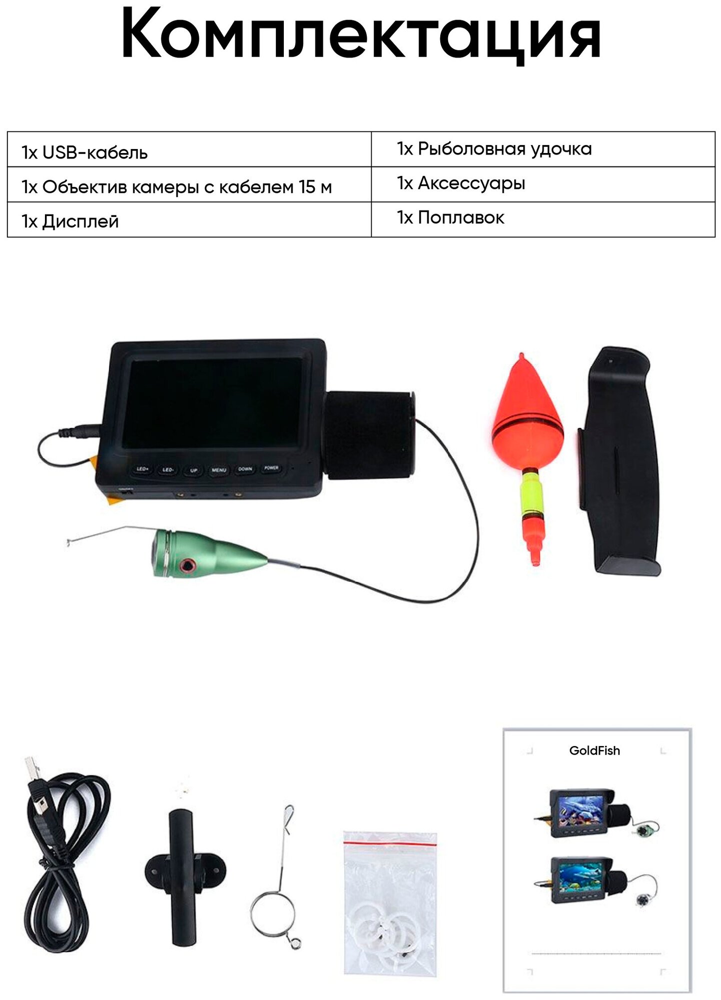 | Комплектация | USB - кабель - 1шт.; Поплавок - 1 шт; 1- Дисплей; 1 x Объектив камеры с кабелем 15 м |