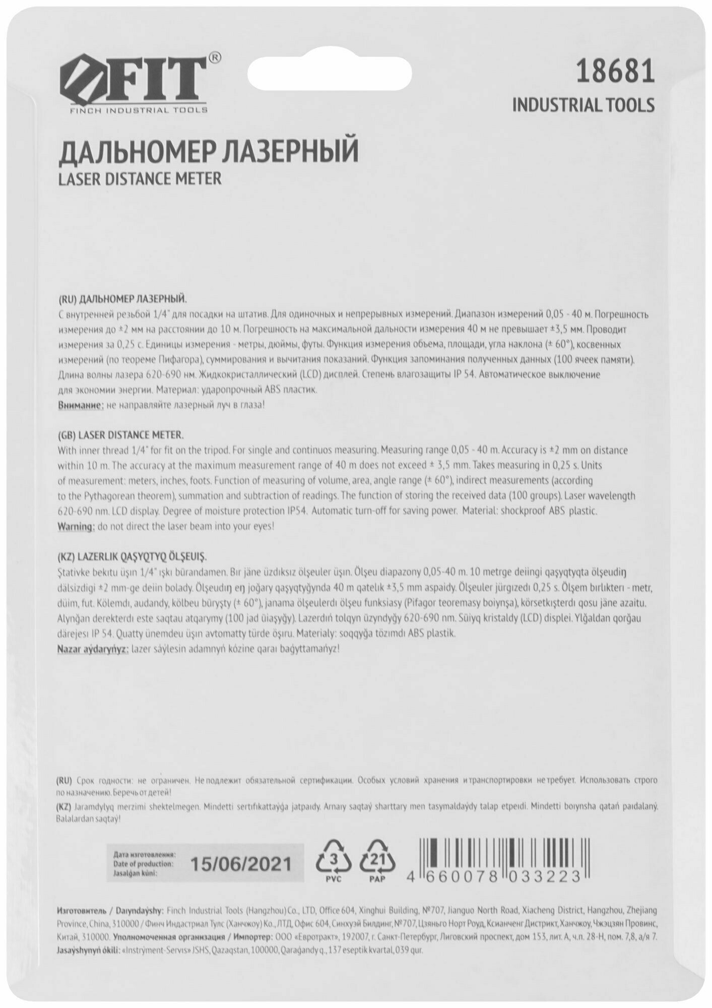 Fit курс Дальномер лазерный, расчет площади объема, LCD дисплей, диапазон 40 м 18677