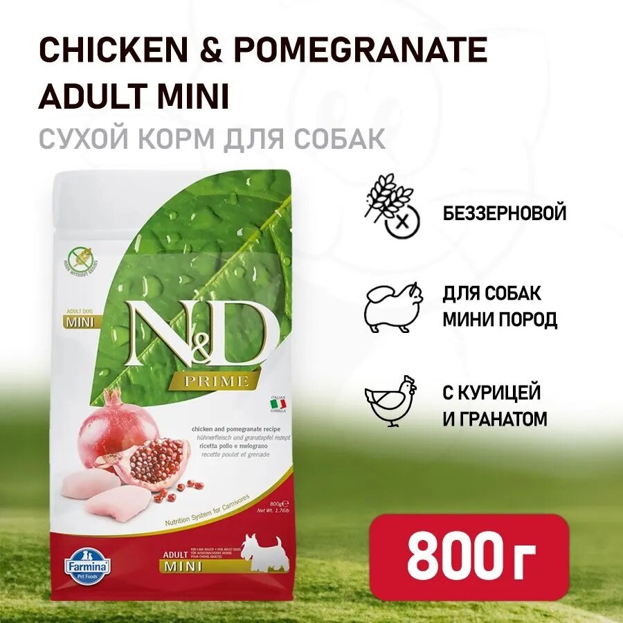 FARMINA DOG N&D PRIME ADULT MINI CHICKEN & POMEGRANATE беззерновой для взрослых собак маленьких пород с курицей и гранатом (0,8 кг)