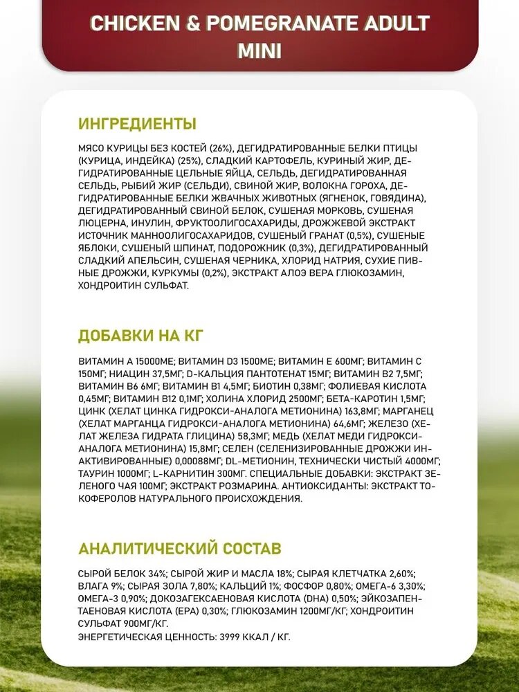 | Состав | свежее мясо курицы без костей (26%), дегидратированное мясо курицы (25%), картофель, куриный жир, дегидратированные цельные яйца, свежая сельдь, дегидратированная сельдь, рыбий жир, гидролизат животных белков, волокна гороха, сушеная морковь, сушеная люцерна, инулин, фруктоолигосахариды, маннанолигосахариды, порошок граната (0,5%), дегидратированные яблоки, порошок шпината, подорожник (0,3%), порошок черной смородины, дегидратированный сладкий апельсин, порошок черники, хлорид натрия, дрожжи сухие пивные, корень куркумы (0,2%), глюкозамин, хондроитин сульфат, экстракт календулы (источник лютеина) |