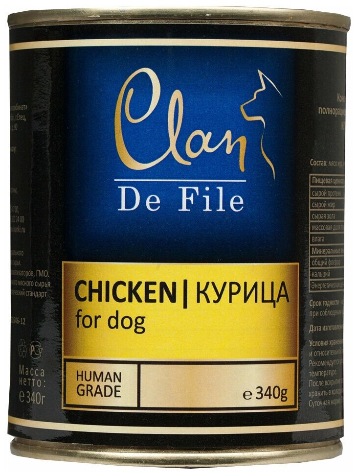 Корм полнорационный консервированный CLAN De File для собак Курица, 340гр, 6 шт.