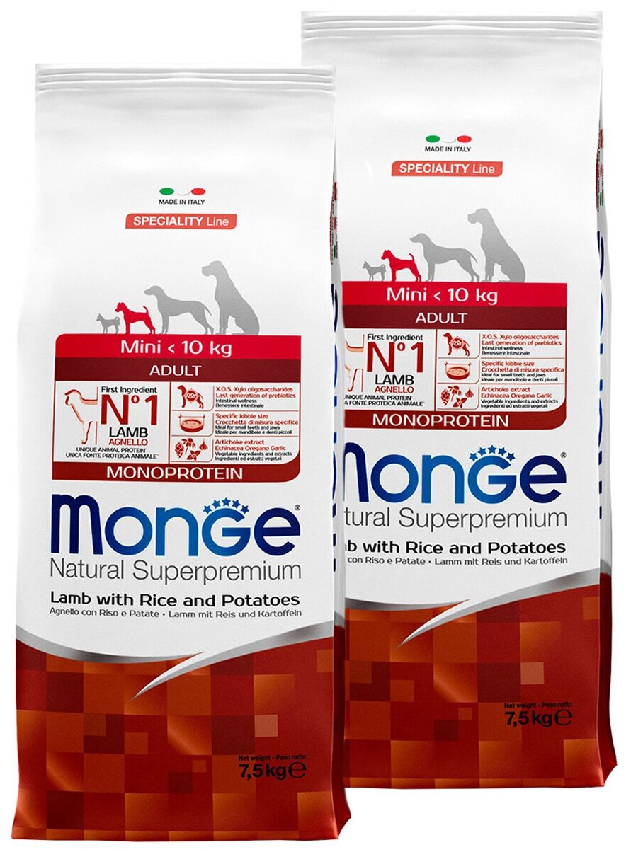 Купить MONGE SPECIALITY DOG MINI ADULT LAMB для взрослых собак маленьких пород с ягненком, рисом и картофелем (7,5 + 7,5 кг)