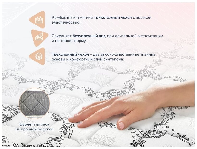 Не потеешь, когда спишь на этом матрасе. Высокий матрас, в меру мягкий и твёрдый. У меня грыжа, протрузии, хронический остеохондроз. На этом матрасе я забываю о болях в спине. |