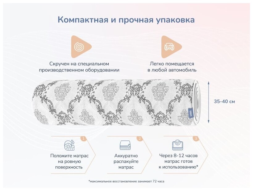 | Отзыв: | Отличный матрас по приятной цене. Спим пока на жёсткой стороне, качество устраивает. Высыпаемся) Распрямился часов за 7, был небольшой специфический запах, прошёл за пару дней. В подарок прилагались 2 подушки. Однозначно рекомендую к покупке |