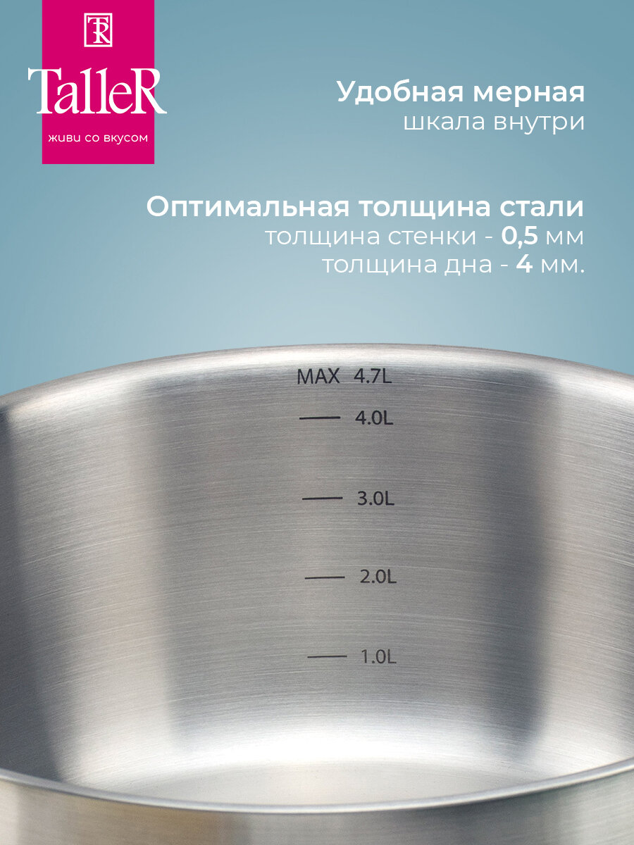 | Отзыв: | Обожаю Таллер, лучшие кастрюли и сковороды у них. Само удобство во всём. Всё продумано: отметки литров, слив, паровые дырочки на крышках. Очень красивые кастрюли. Пользуюсь ими с огромным удовольствием и замену, сколько искала, не нашла, да и не хочу! Спасибо Яндекс маркету, цена гораздо ниже, чем у конкурентов. |