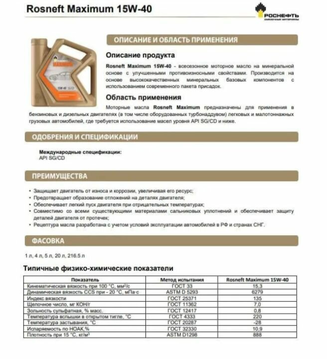 | Класс вязкости SAE | 15W-40 |