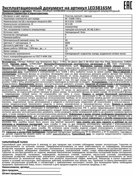 Купить Ultraflash LED3816SM фонарь аккум. 220В, желт., 9LED, 2 режима, SLA, пласт., коробка 12859
