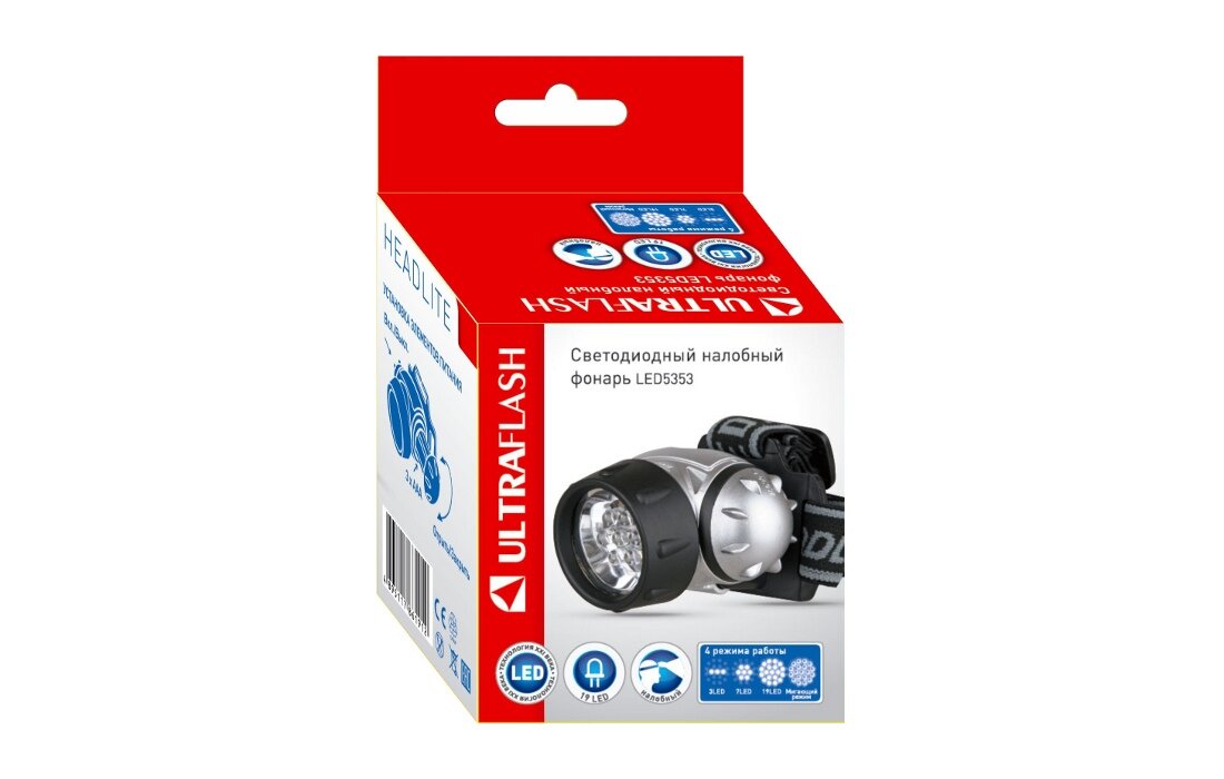 Купить Ultraflash LED5353 (фонарь налобн металлик, 19LED, 4 реж, 3XR03, пласт, коробка)