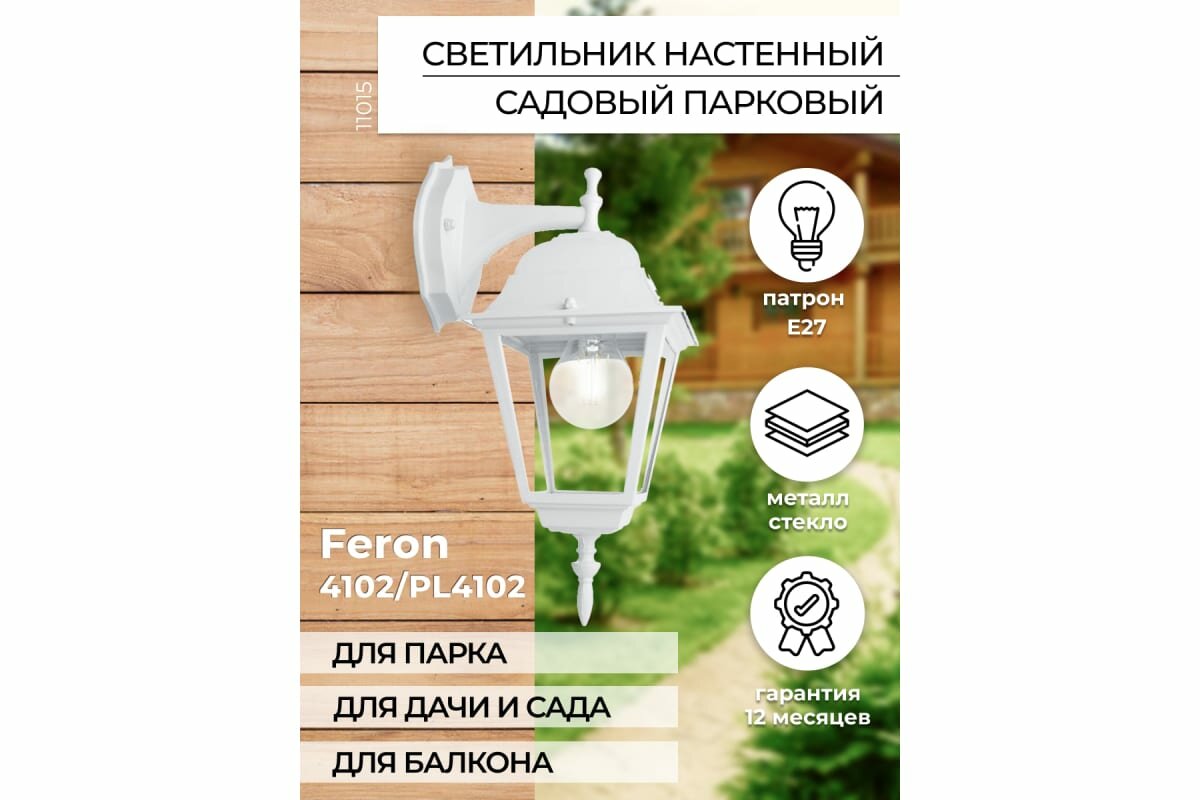 Купить Feron Светильник садово-парковый Feron 4102 четырехгранный на стену вниз 60W E27 230V, белый 11015 .