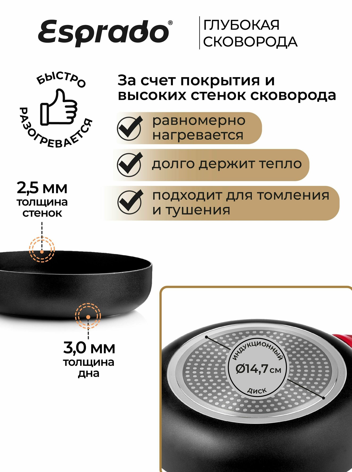 Сковорода , сковородка , сковорода 24 см , сковорода из алюминия, сковорода для индукционной плиты, сковорода с антипригарным покрытием, сковорода глубокая Frontera Esprado
