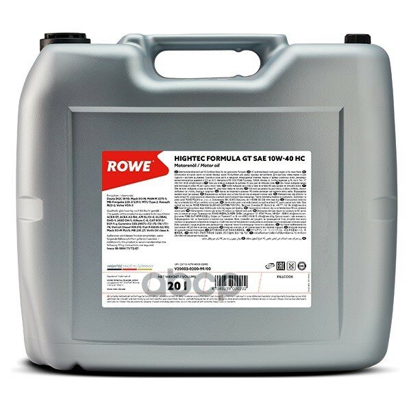 Купить ROWE Rowe Hightec Formula Gt Sae 10w-40 Hc (20л.)Acea E7, Acea A3/B4, Api Ci-4, Global Dhd-1, Jaso Dh-1