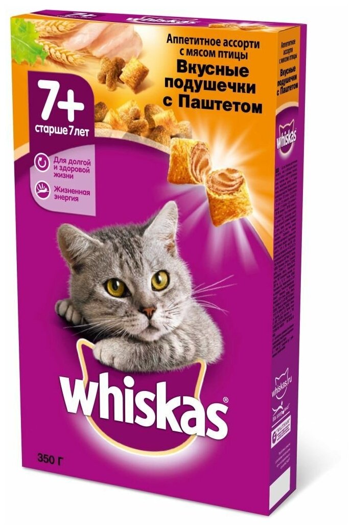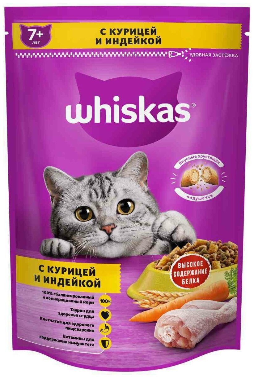 Сухой корм Whiskas для кошек 7+, мясо птицы, подушечки, 350 г