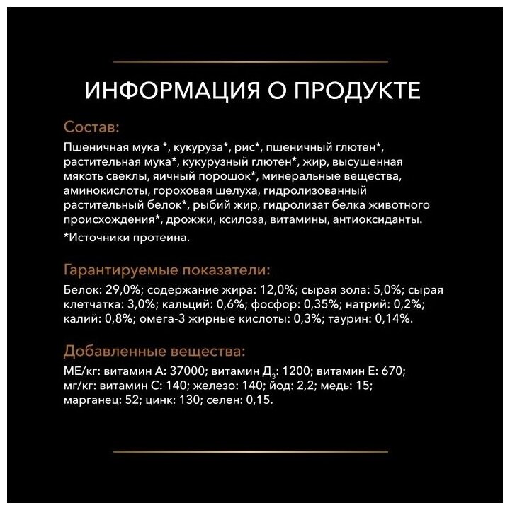 | Состав | пшеничная мука, кукуруза, рис, пшеничный глютен, растительная мука, кукурузный глютен, жир, высушенная мякоть свеклы, яичный порошок, минеральные вещества, аминокислоты, гороховая шелуха, гидролизованный растительный белок, рыбий жир, гидролизат белка животного происхождения, дрожжи, ксилоза, витамины, антиоксиданты |