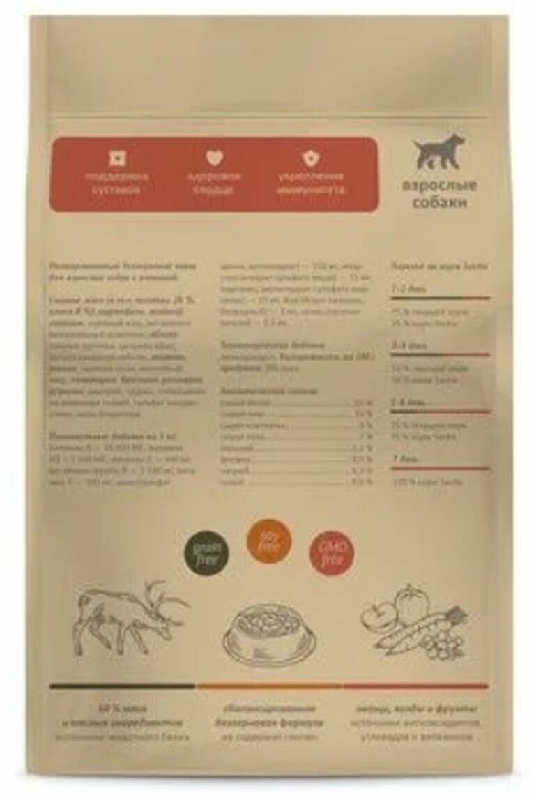 | Пищевая ценность | мясо (в т.ч телёнка 26%, оленя 8%), картофель, зелёный горошек, куриный жир, витаминно-минеральный комплекс, яблоко, пивные дрожжи, цельное яйцо, пульпа сахарной свёклы, морковь, тыква, льняное семя, лососёвый жир, ламинария, брусника, куркума, розмарин, цикорий, таурин, глюкозамин из животных тканей, сульфат хондроитина, юкка Шидигера. |