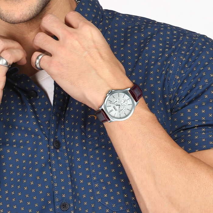 | Минусы: | На моей руке корпус немного мелковат. Ремешок в месте крепления ке часам тоже визуально уменьшает размер и хоть и пишут, что кожа, но искусственная! |