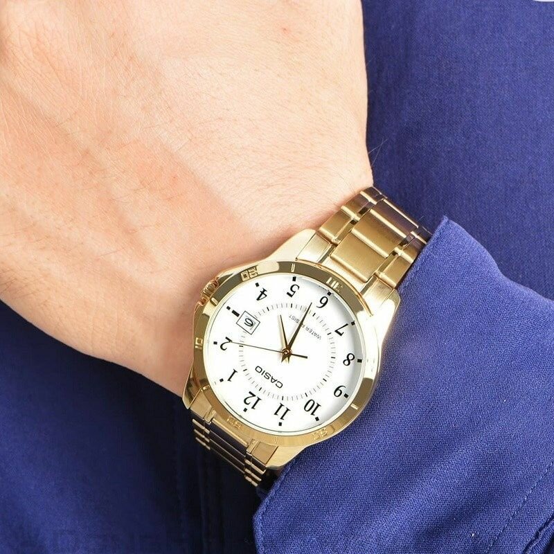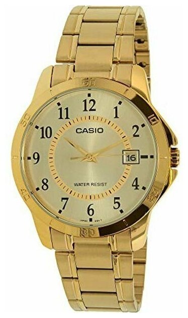 Наручные часы CASIO MTP-V004G-1B кварцевые, водонепроницаемые, подсветка стрелок, золотой