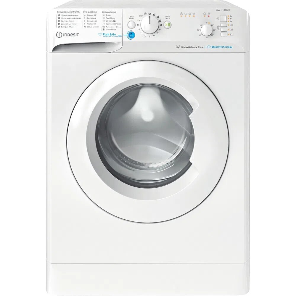 Стиральная машина Indesit BWSB 61051 WWV RU, макс. нагрузка 6 кг, отжим 1000 об/мин, 16 рабочих программ, цвет белый