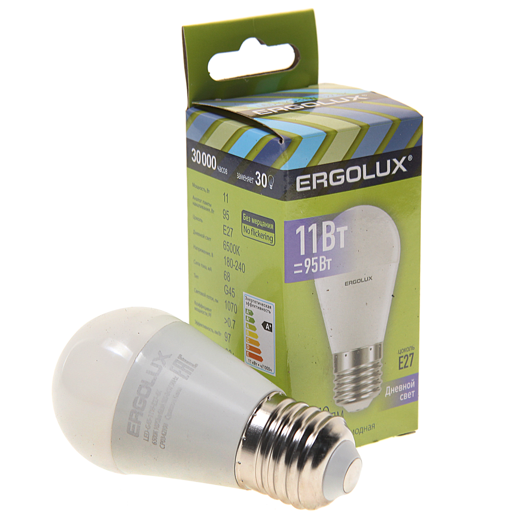 Лампа Светодиодная Шар Ergolux Led-G45-11W-Е27-6К (6500К 172-265В) ERGOLUX арт. LEDG4511WЕ276К