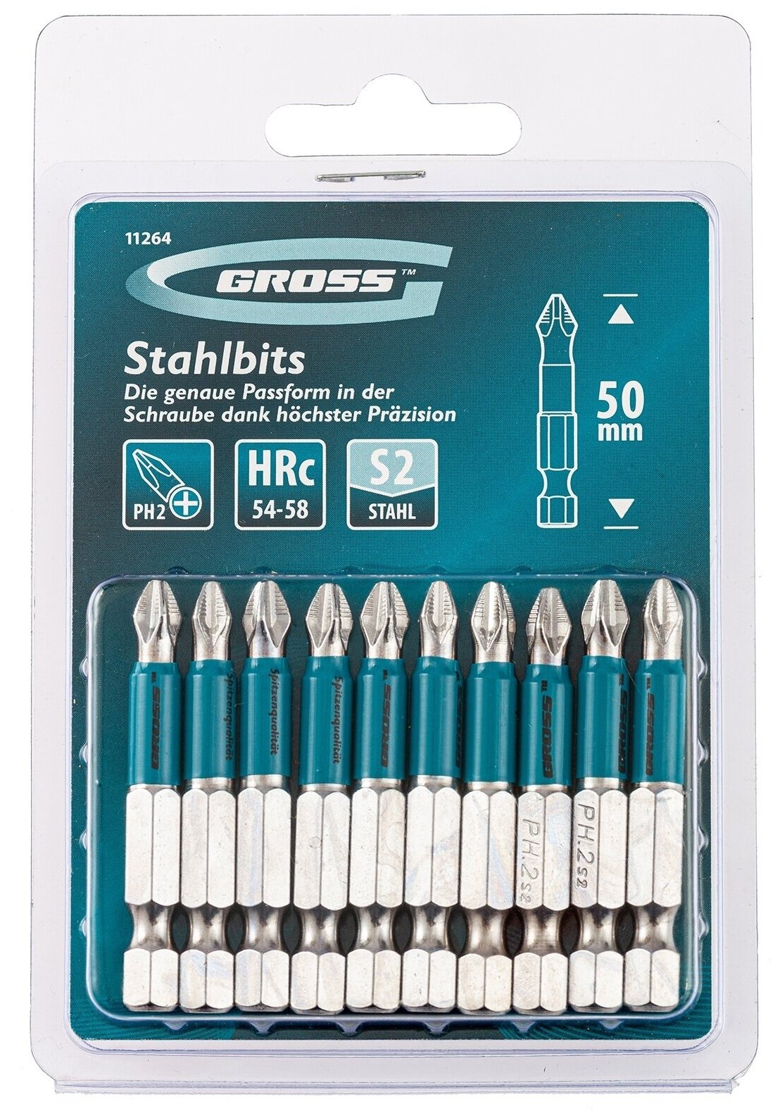 Биты GROSS 11264, бит PH2 х 50, сталь S2, 10 шт