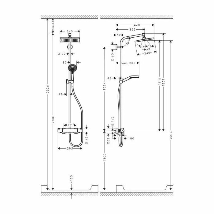 | Дополнительная информация | высота стойки для душа: 1201 мм; диаметр душевой лейки: 100 мм; длина верхнего душа: 240 мм; ширина верхнего душа: 240 мм; длина держателя верхнего душа: 350 мм; предохранительный ограничитель при 40°C; регулируемое по высоте крепление ручного душа; подъемная труба может быть укорочена по высоте; типы струй верхнего душа: Rain; тип струи ручной душ: Rain, IntenseRain; с термостатическим смесителем; страна: Германия |