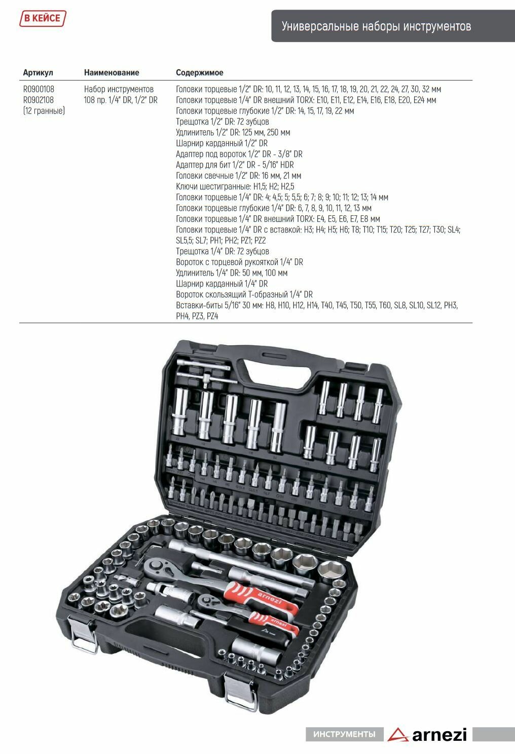 Купить Набор инструментов 108 предметов 1/4"DR, 1/2"DR ARNEZI R0900108