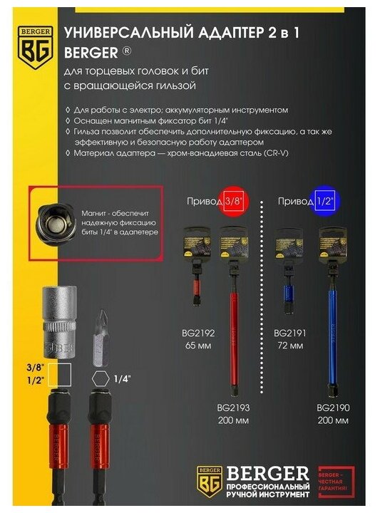 Адаптер универсальный 2в1 BERGER BG2191 для торцевых головок 1/2" и бит 1/4" с вращ. гильзой 72 мм