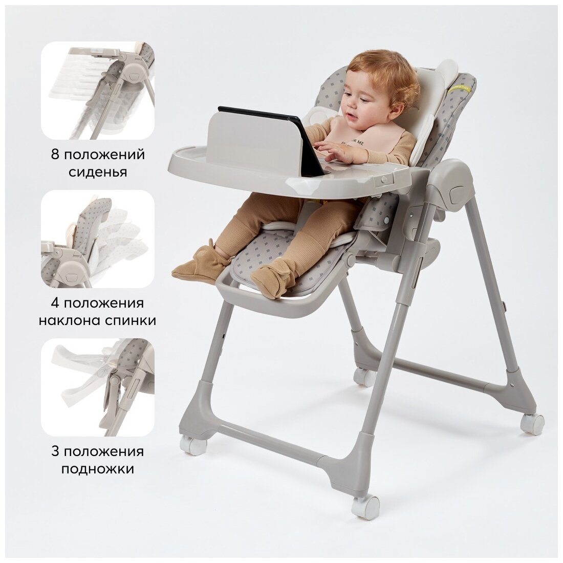 Стульчик для кормления Happy Baby WILLIAM PRO, до 20 кг, 4 поворотных колеса, мягкий вкладыш, серый интересное: