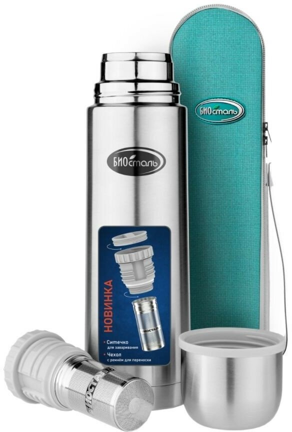 Термос классический Вакуумный с узкой горловиной, пробка-контейнер с ситичком, чехол Биосталь/Biost (1),NB-1000BZ