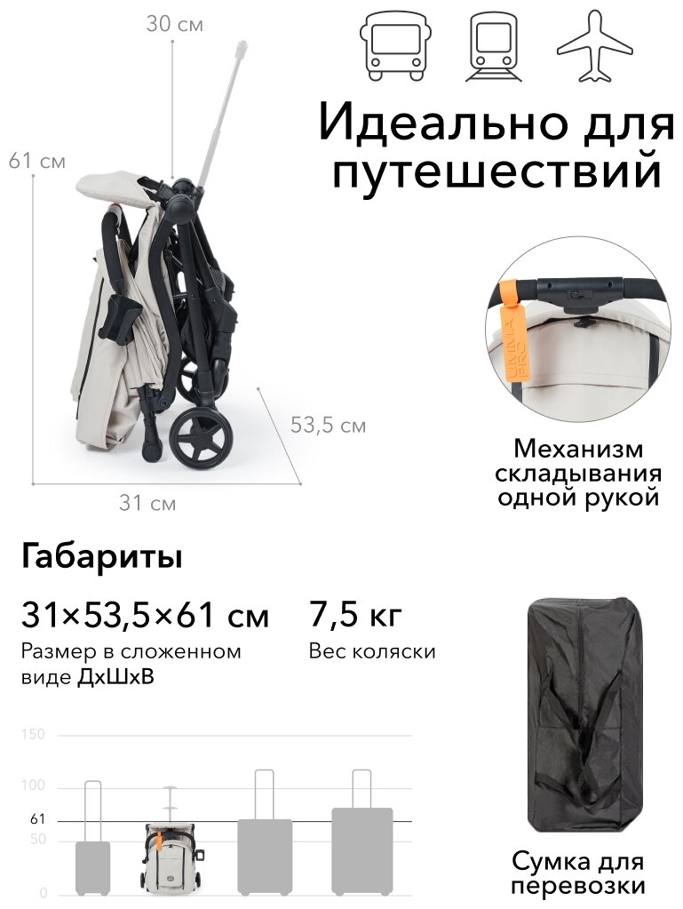 | Дополнительная информация | положение колес в сложенном виде: вниз; диаметр передних колёс 12,5см, задних 14 см; боковая вентиляция, задние колеса оснащены тормозным механизмом |