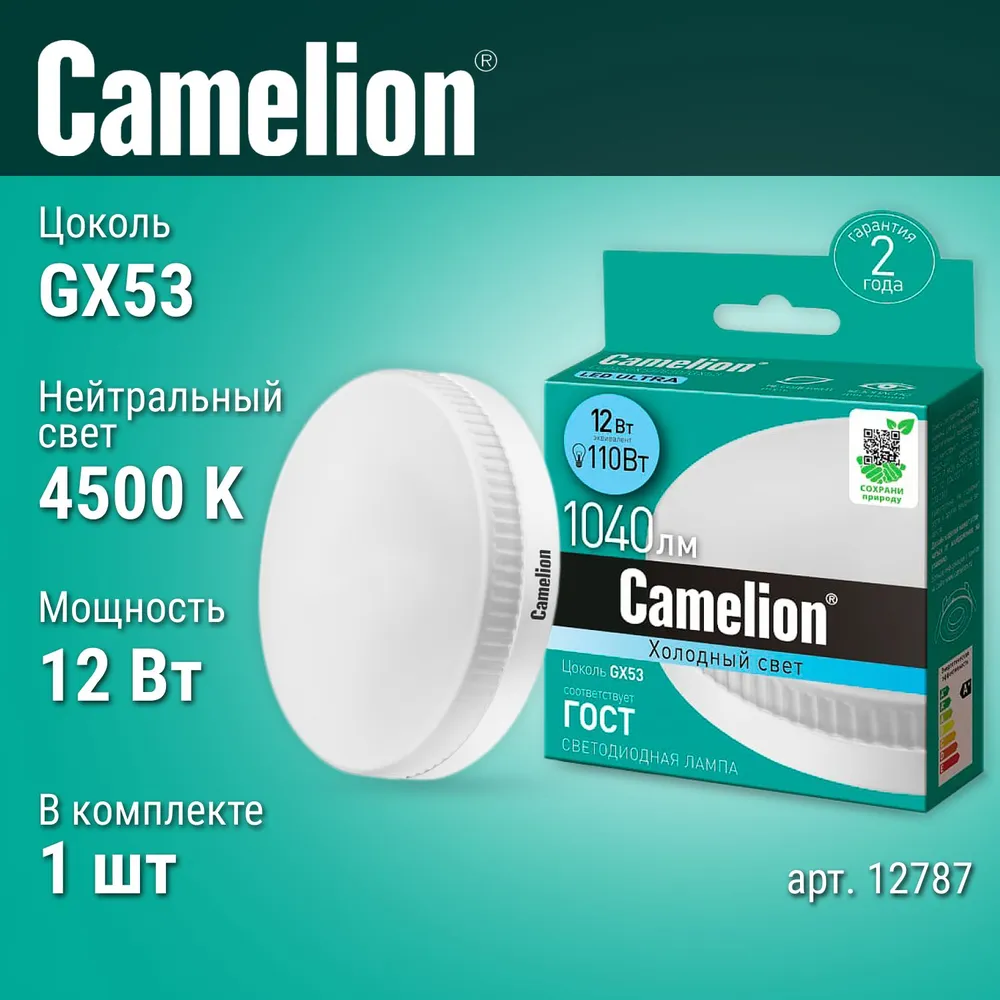Лампа светодиодная GX53, 12 Вт, 110 Вт, таблетка, 4500 К, свет холодный белый, Camelion интересное: