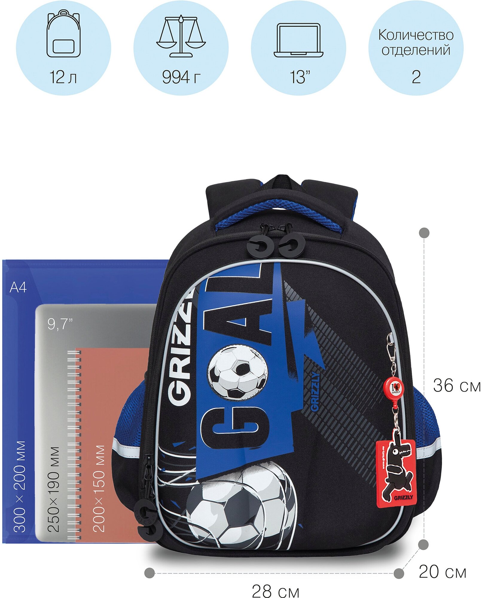 Ранец GRIZZLY анатомическая спинка, c бейджем, для мальчиков, "FOOTBALL", 36х28х20 см, RAz-287-6/2 интересное: