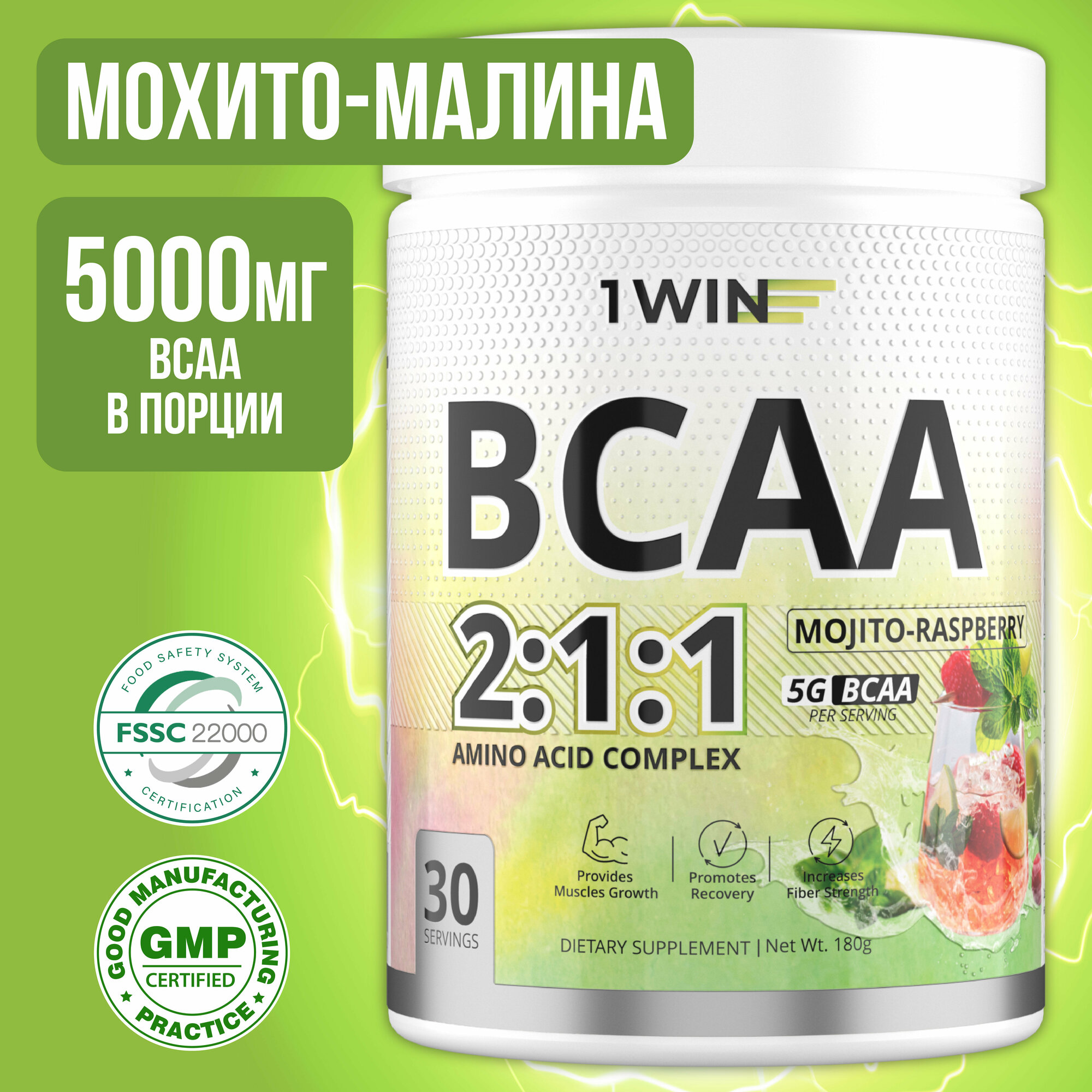 BCAA 2:1:1 Аминокислоты порошок 1WIN (БЦАА), Быстрорастворимые, вкус Мохито-Малина, 30 порций