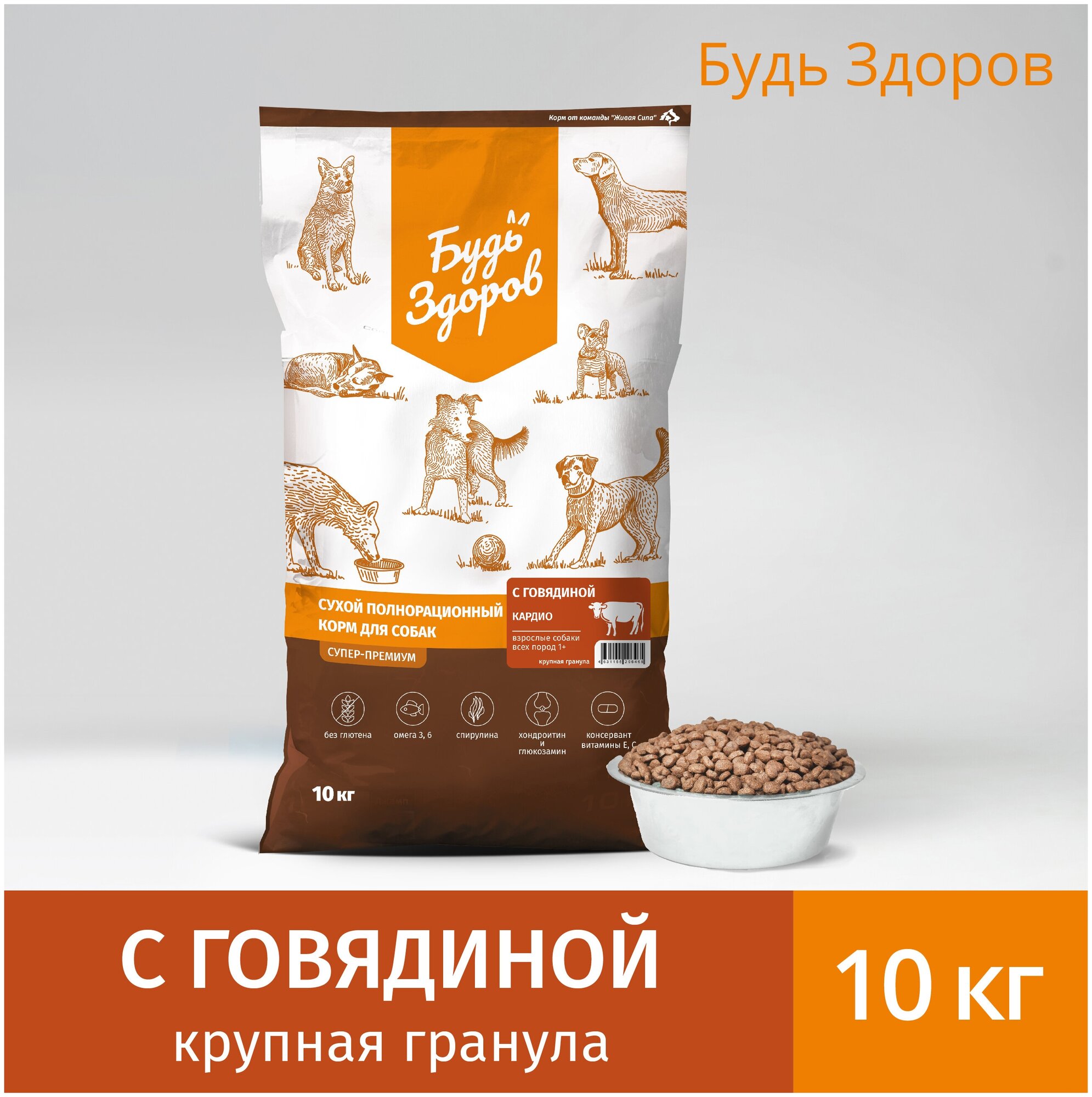 Живая Сила Будь Здоров сухой корм с говядиной для взрослых собак всех пород. Кардио. Крупная гранула 10 кг