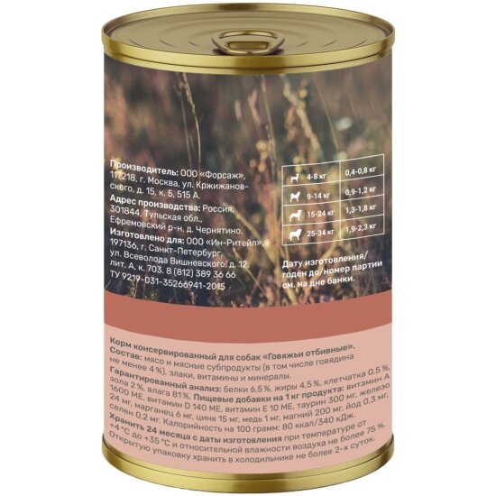 | Дозировка | - вес собаки 4-8 кг - 400-800 г - вес собаки 9-14 кг - 900-1200 г - вес собаки 15-24 кг - 1300-1800 г - вес собаки 25-34 кг - 1900-2300 г |
