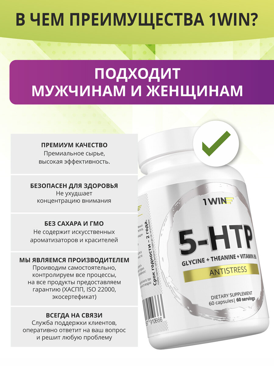 Купить 5 HTP 100 мг 1WIN (5НТР, 5-ХТП, 5-гидрокситриптофан), витамины с теанином и глицином