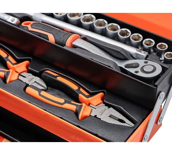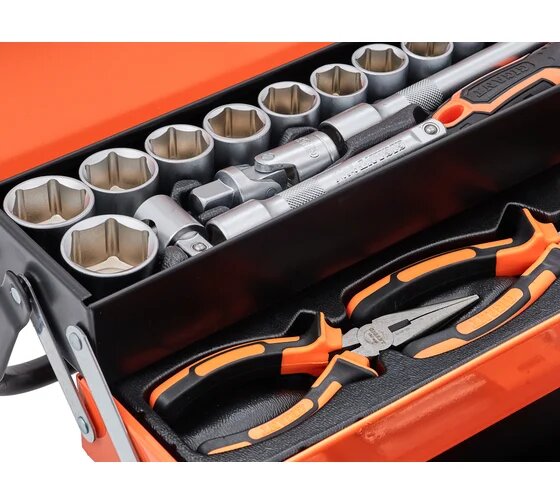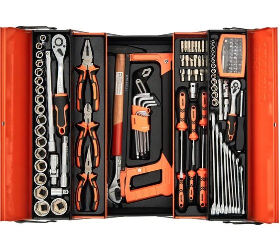 | Дополнительная информация | Комплектация * 12 торцевых головок 1/4; 1 карданный шарнир; 2 удлинителя 1/4; 1 вороток-отвертка; 1 адаптер SQ1|4; 31 бита; 1 трещетка; 9 комбинированных ключей; 18 торцевые головки 1/4; 2 удлинителя 1/4; 1 шарнир карданный; 1 трещотка; 1 трехпозиционный адаптер; 1 переставные клещи; 1 бокорезы; 1 комбинированные плоскогубцы; 1 тонкогубцы; 9 имбусовые ключи; 6 отвертки; 1 адаптер SQ1|2; 17 бит; 1 ножовка; 1 молоток; 1 разводной ключ; Упаковка. |