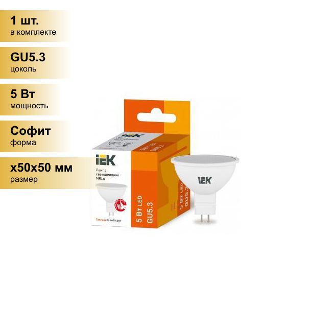Лампа светодиодная IEK ECO софит 3000K, GU5.3, MR16, 5 Вт, 3000 К