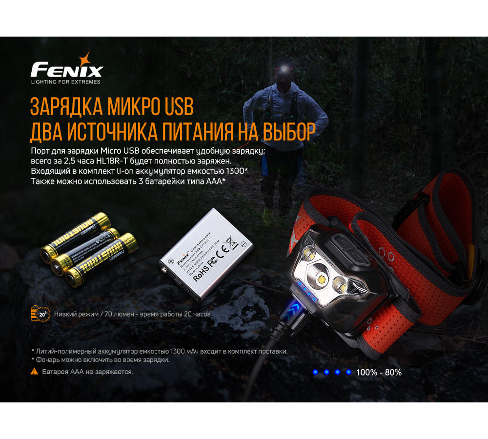 | Подробная комплектация | Налобный фонарь Fenix HL18R-T, Аккумулятор ARB-LP1300; Кабель для зарядки micro-USB |