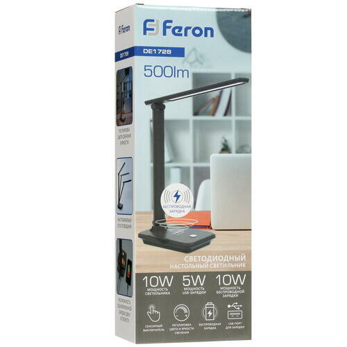Настольный складной диммируемый светильник Feron 25W,3000-6000К, беспроводная зарядка и USB порт, бе .