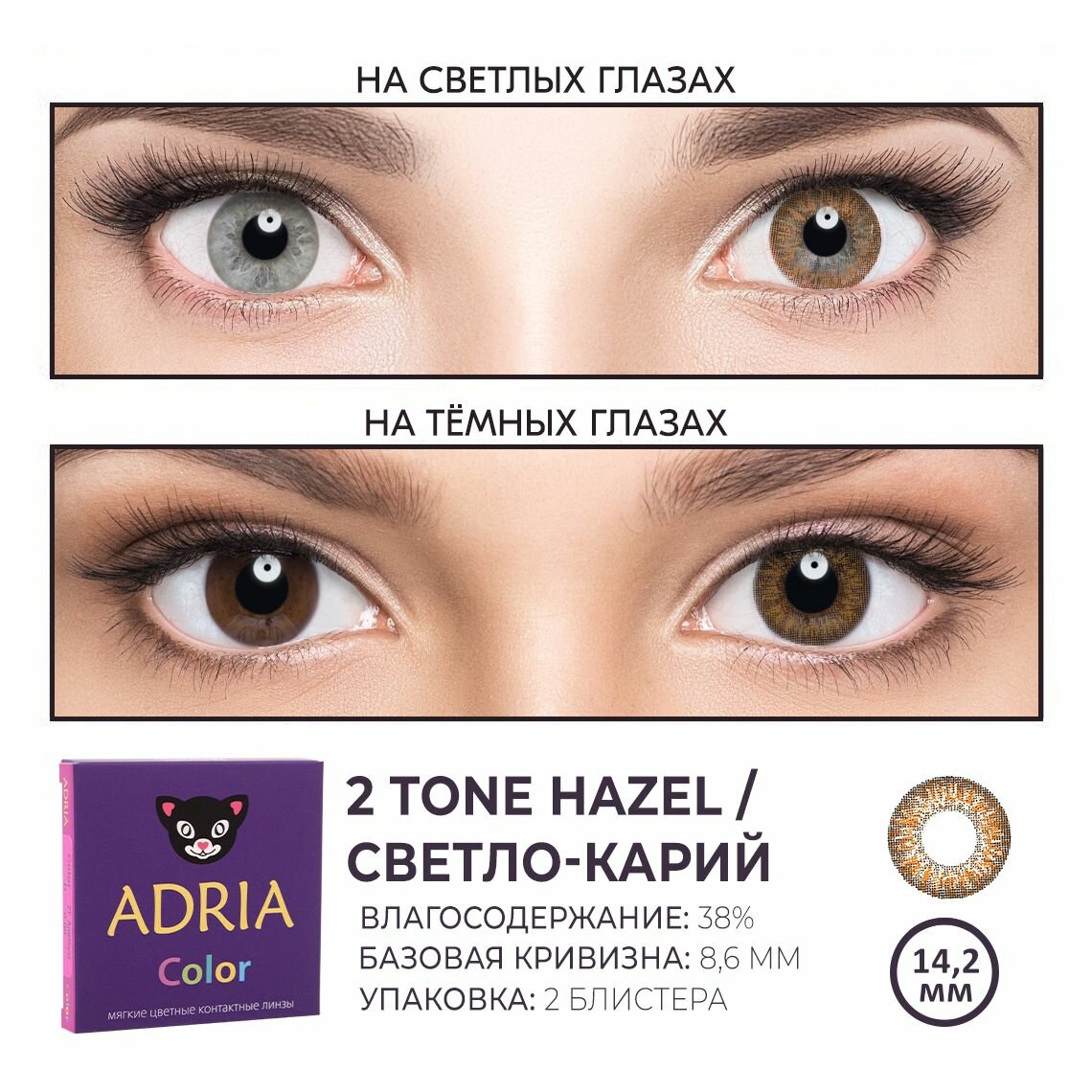 Купить Контактные линзы цветные ADRIA, Adria Color 2T, Квартальные, HAZEL, -8,50 / 14,2 / 8,6 / 2 шт.