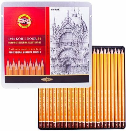 Карандаши чернографитные KOH-I-NOOR 1500, набор 24 шт., 8В-10H, без резинки, металлическая коробка, 1504024001PL Комплект - 1 шт .