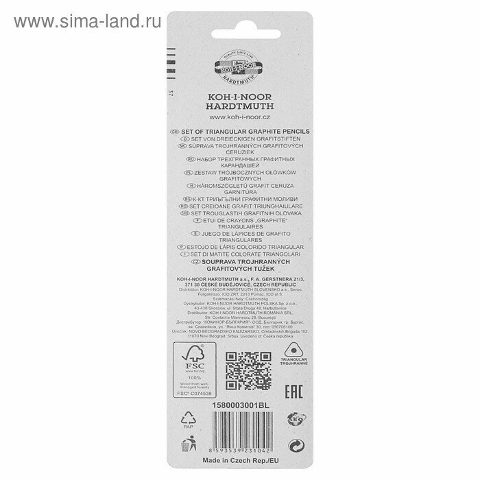 Купить Набор карандашей ч/г Koh-I-Noor "1580" 3шт., H, HB, B, трехгранный, заточен., блистер, европодвес