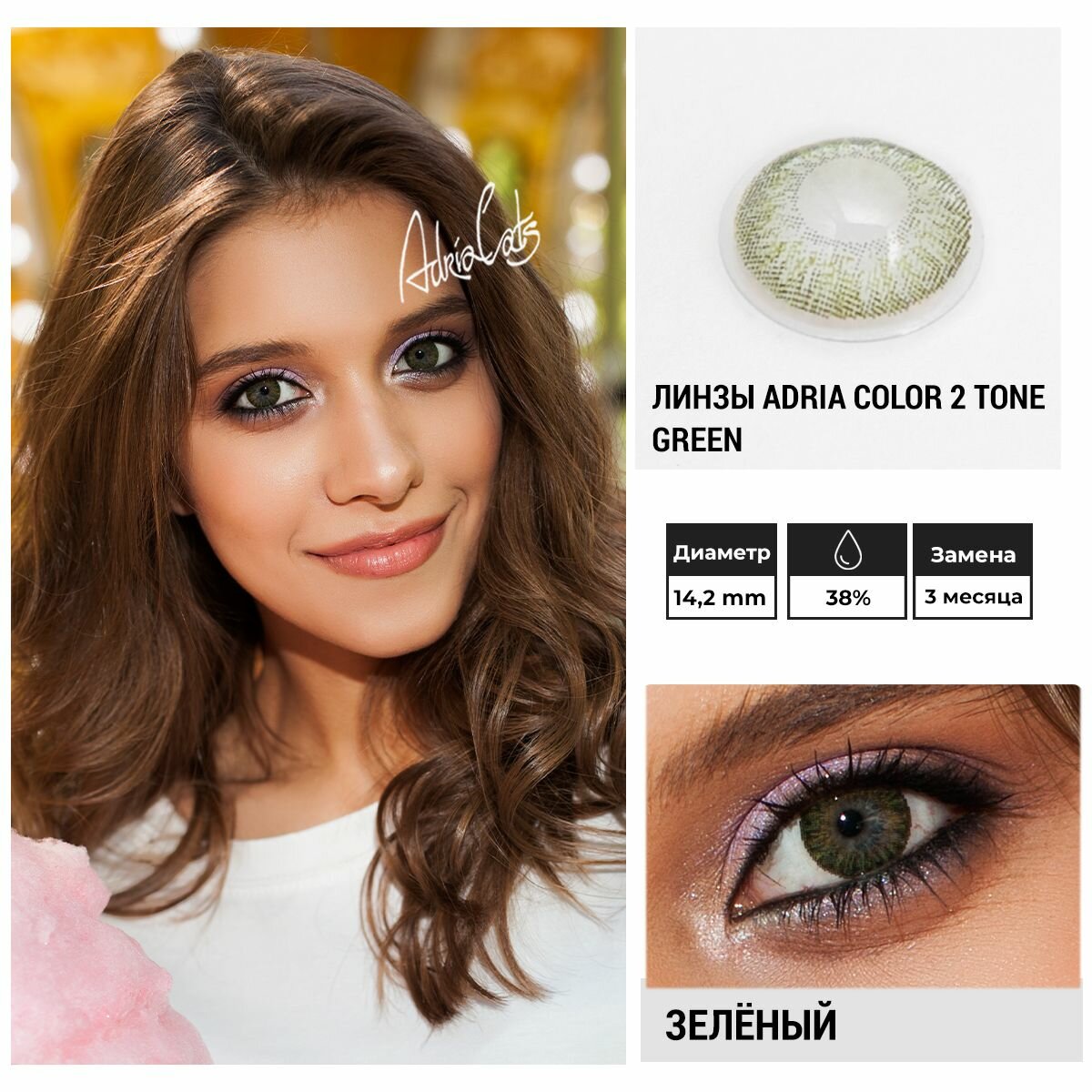 Контактные линзы цветные ADRIA, Adria Color 2T, Квартальные, GREEN, -3,00 / 14,2 / 8,6 / 2 шт.