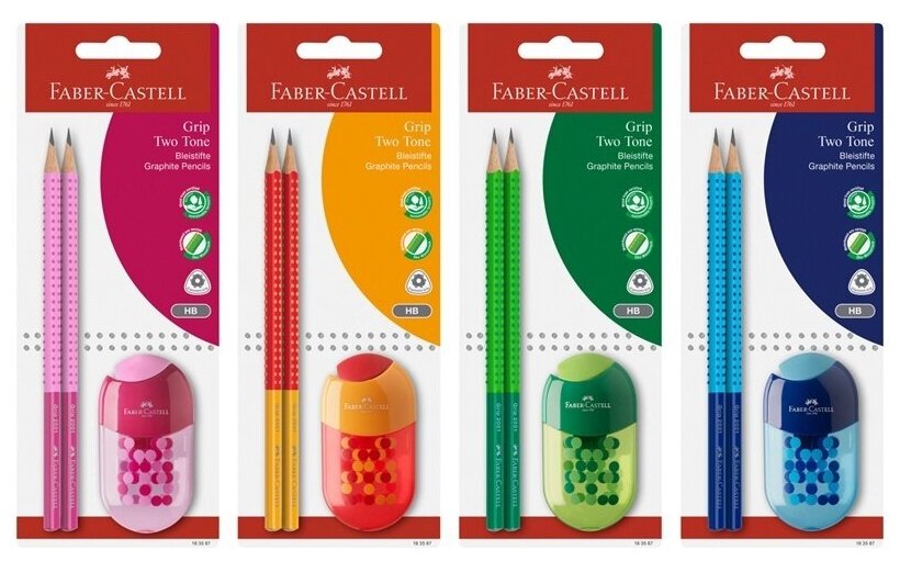 Купить Чернографитовые карандаши Faber Castell Карандаши чернограф. Faber-Castell "Grip Two Tone", НВ, 2шт. (+точилка с ластиком), ассорти (розовый, зеленый, синий или желто-красный)