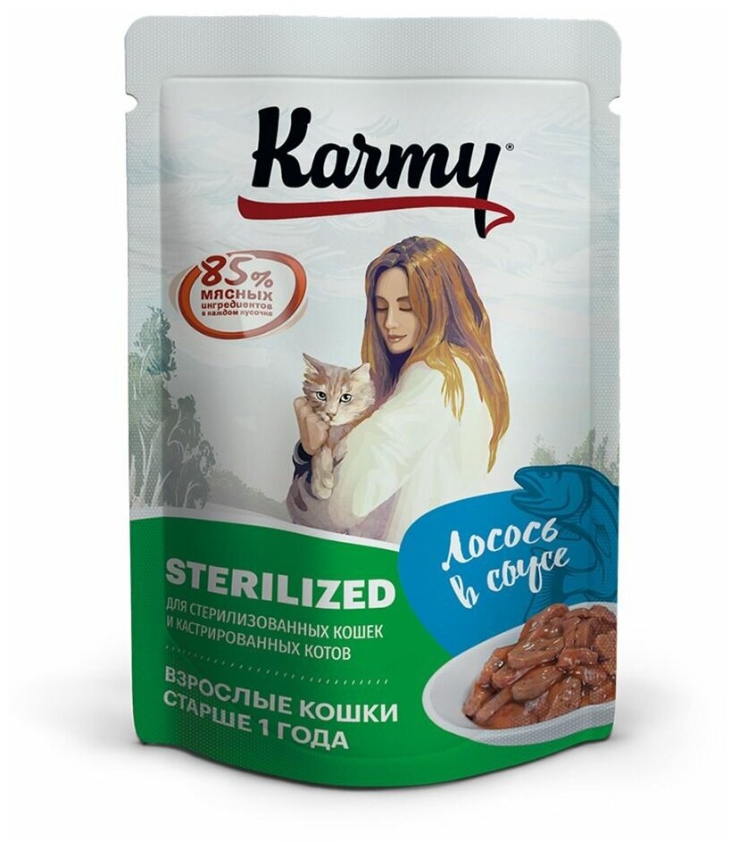 Влажный корм KARMY STERILIZED для стерилизованных кошек и кастрированных котов старше 1 года Лосось в соусе Паучи 24шт по 80г