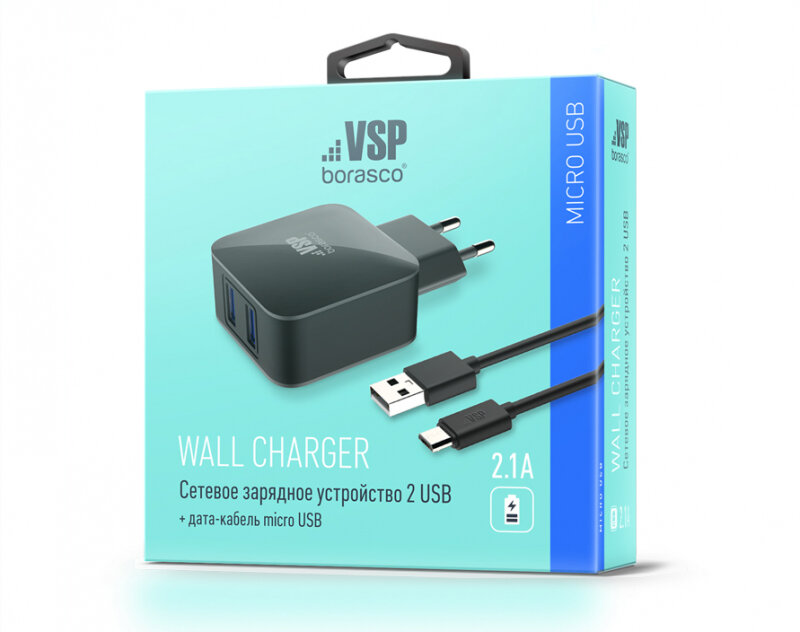 Сетевое зарядное устройство BORASCO 2xUSB, microUSB, 2.1A, черный [20649]