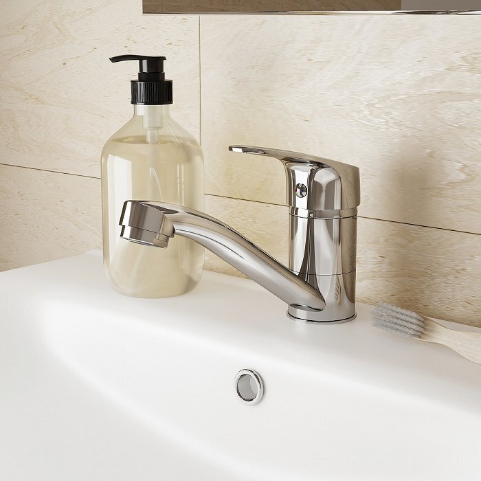 Удобен в использовании из-за поворотного излива. Компактный, в не большую раковину подходит идеально. |